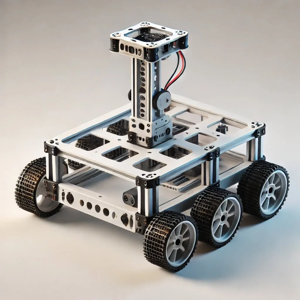 RC robot optimized for carrying robotic arms. It features a flat, compact chassis with four wheels, made for 3D printing in PLA, focusing on functionality and ease of assembly.