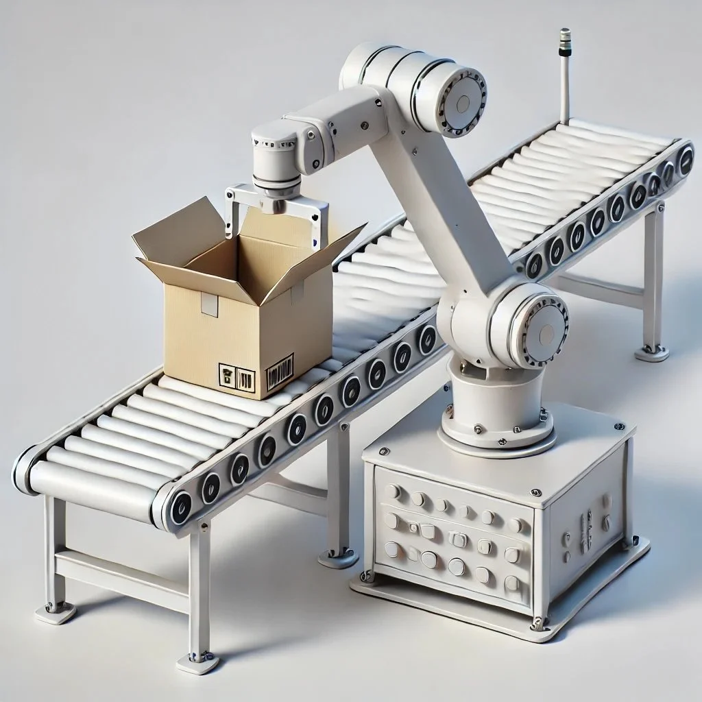 Industrial robot designed for picking items from a conveyor belt. The robot features a compact base and a movable platform equipped with a mechanism to transfer items to a nearby cardboard box.